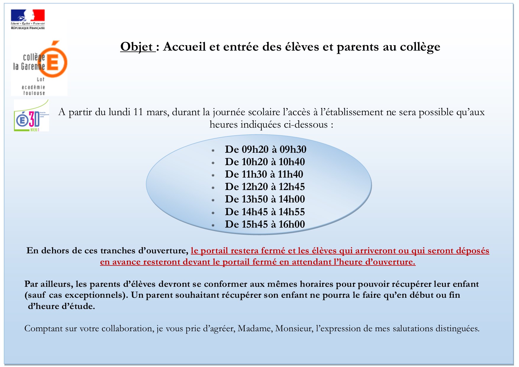 HORAIRES D'OUVERTURE DU PORTAIL ET ACCES AU COLLEGE : rappel